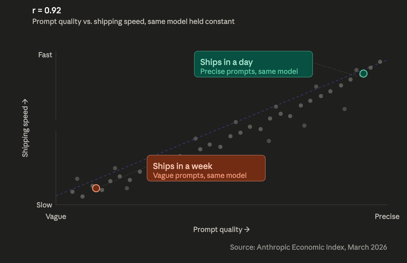 That’s the correlation between prompt quality and productivity outcome, holding tool use constant. In plainer English: once two developers are using the same model, the single variable that explains whether they ship in a day or a week is how they write the prompt.