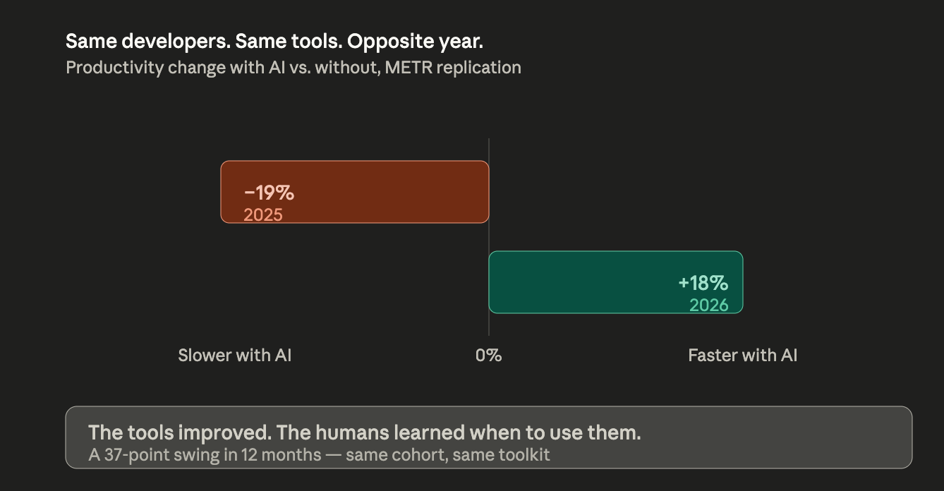 The METR study last year said developers with AI were 19% slower than developers without. That was the contrarian stat of 2025. Same cohort, recut this year: 18% faster. Same developers, same tools. What changed is how they were using them.