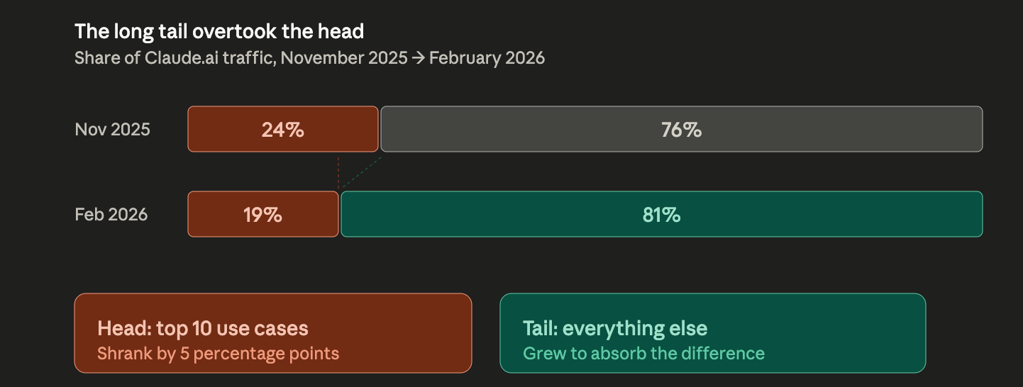 The sign this has really shifted is quieter: the top 10 use cases dropped from 24% of all traffic to 19%. That doesn’t sound like much. It means the tail of “what people use this for” has exploded. The long tail is now bigger than the head. People are using Claude for things nobody thought to optimize for.