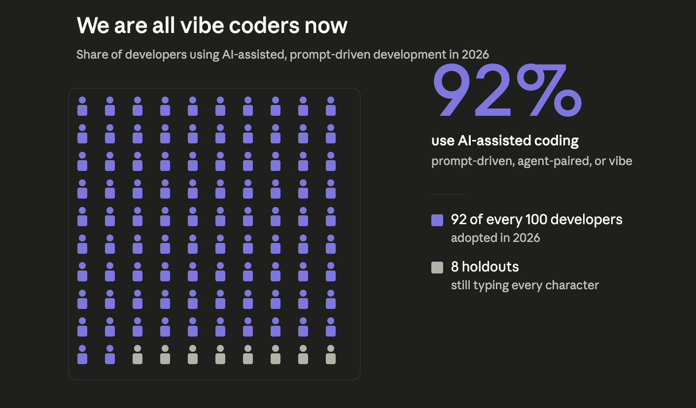 Andrej Karpathy coined the phrase “vibe coding” almost as a half-joke, and the half that wasn’t a joke became a movement. Ninety-two percent of developers in 2026 have adopted some flavor of AI-assisted, prompt-driven development. We are all vibe coders now.