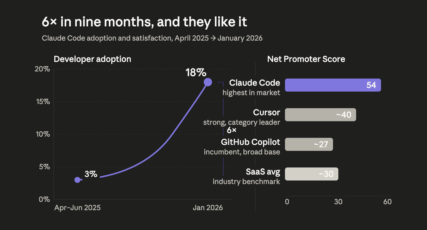 Claude Code’s adoption has climbed from 3% to 18% in nine months, with an NPS of 54 - the highest in the market. And the developers driving that adoption are not juniors looking for a shortcut. They are the senior engineers who already know what good code looks like and have figured out how to use the model to write more of it without sacrificing the thing that made them senior in the first place.